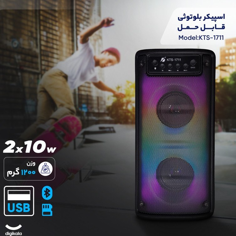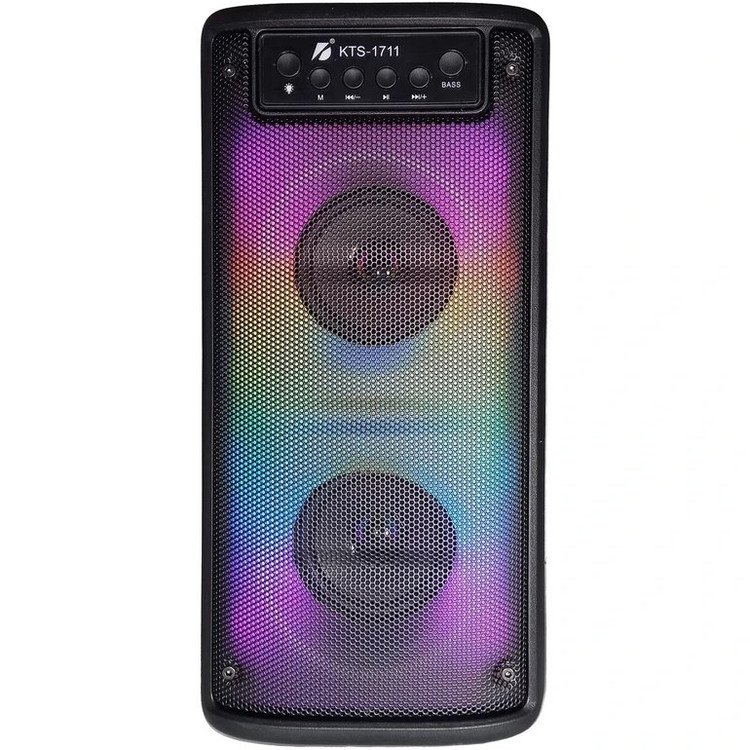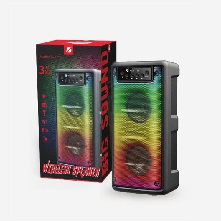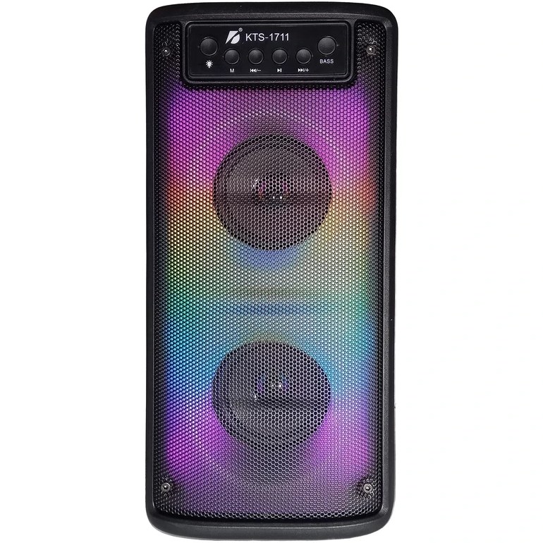 اسپیکر KTS-1711 با پشتیبانی از بلوتوث، USB، کارت حافظه، رادیو FM و نورپردازی LED، یک انتخاب مناسب و مقرونبهصرفه برای پخش موسیقی در محیطهای کوچک و استفاده روزمره است.