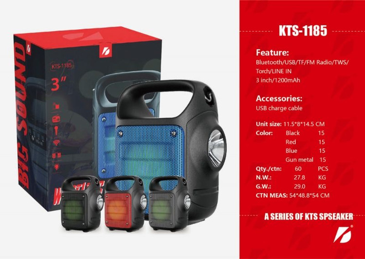 اسپیکر بلوتوثی قابل حمل مدل KTS-1185 با طراحی جمعوجور و امکانات متعدد، گزینهای مناسب برای پخش موسیقی در محیطهای مختلف است. مشخصات این دستگاه به شرح زیر میباشد: